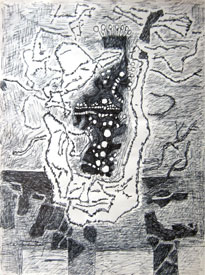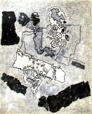 It is also interesting to note that the artist while painting discards the accepted mode of placing the canvas vertically in front but lays it out flat on the ground and works on it from all angles. The work process also gives inkling to the artist's unconventional, un-inhibited thinking process. The same tendency is also reflected in the manner which Santhanaraj handles color which is the other source of inspiration. Color not with its emotive quality but rather the atmosphere it exudes. The artist in his paintings exploits the most fundamental elements to express his thoughts.