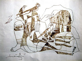 One of the most defining aspect of AP Santhanaraj's works would be the quality of line. It is this fundamental element, which sets apart the artists style. He uses this element without any inhibitions exploring it endlessly and creating a unique visual language. As the artist says " I am hungry about painting. What comes out of it, I don't know. All my intentions are not to accept a preconceived form. Circumstances force me to accept a particular form.”